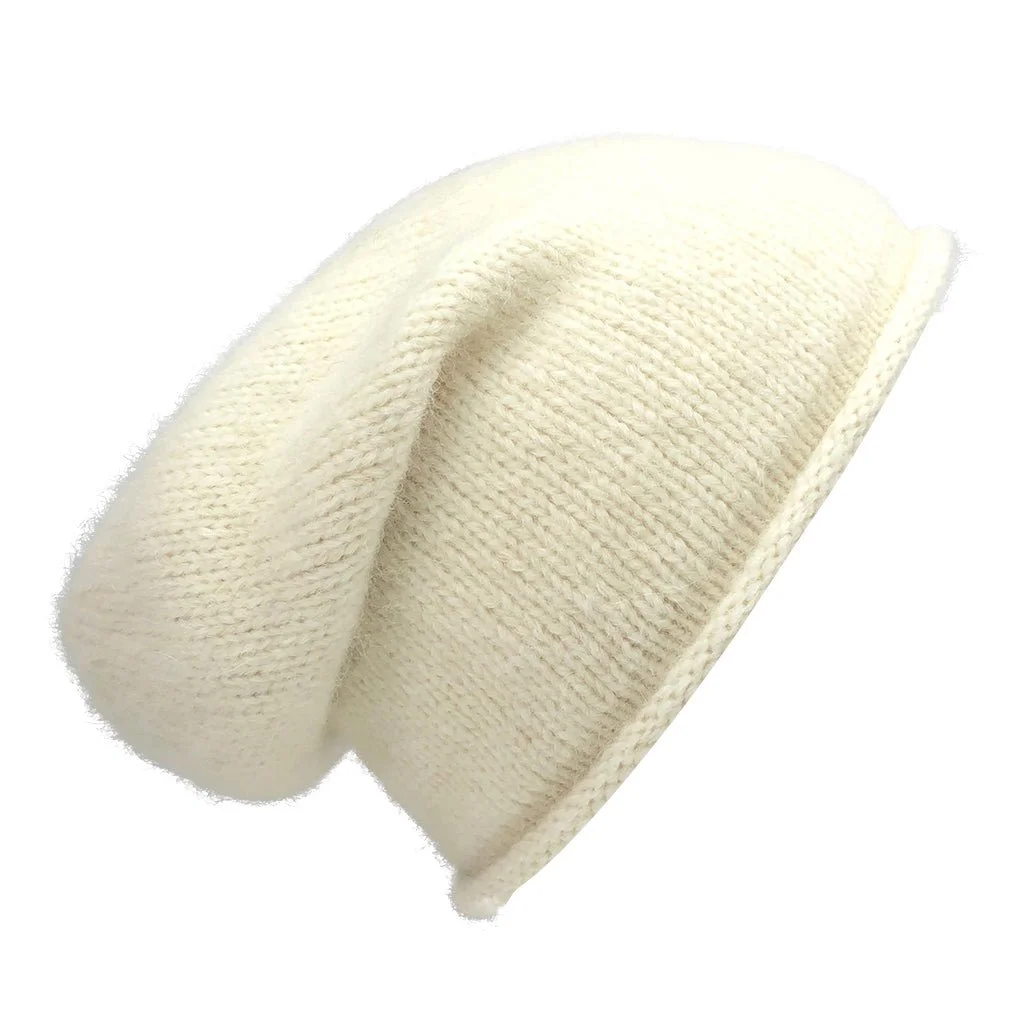 Keep warm and look cool with this perfectly slouchy beanie. Throw it on and scrunch it back for an easy every day accessory. Alpaca fiber is considered by the fashion industry to be one the greenest, most natural and softest fibers in the world. It is prized for its unique silky and luxurious feel and has a lesser tendency to pilling. This classic beanie is made on a hand knitting machine by a weaving collective in Peru.
